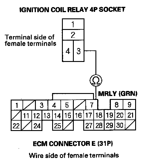 12. Check for continuity between ignition coil relay 4P socket terminal No. 3 and ECM connector terminal E7.