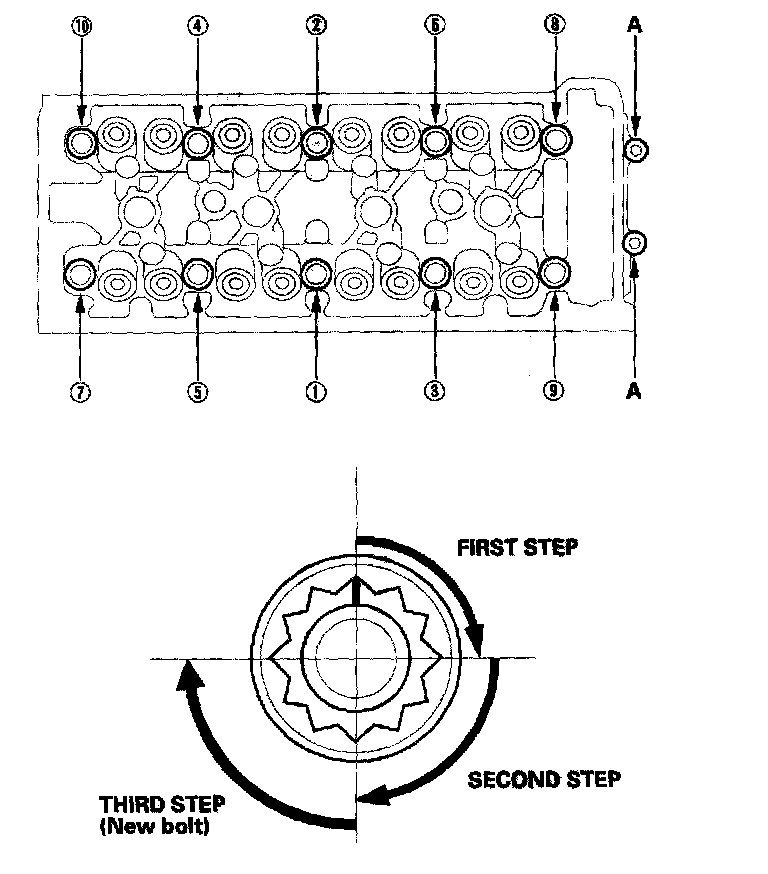 Cylinder HeadTighten the cylinder head bolts in sequence to 29 Nm (3.0 kgf-m, 22 ft. lbs.). Use a beam-type torque wrench. When using a preset-type torque wrench, be sure to tighten slowly and do not overtighten. If a bolt makes any noise while you are torquing it, loosen the bolt and retighten it.