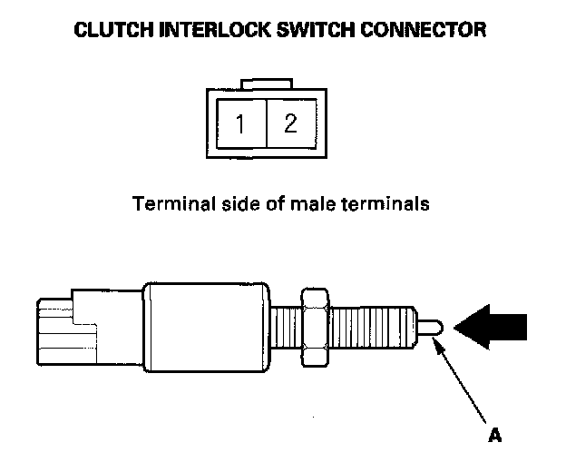 2. Check the clutch interlock switch connector terminals for continuity. There should be no continuity between the terminals with the button (A) released, and there should be continuity with the button pressed.