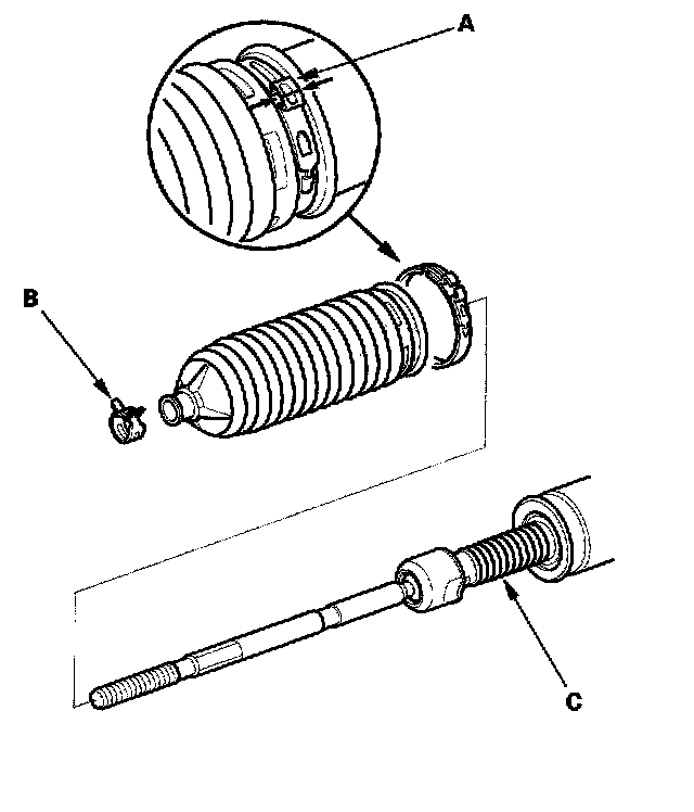6. Center the steering rack within its stroke. Install the boots (A) in the rack end with the tie-rod clips (B). Clean off any grease or contamination from the groove around (C) on the housing.