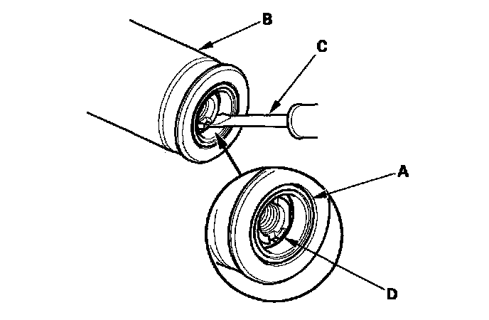 1. Install a new lock washer (A) on the rack shaft. Align the lock washer tabs (B) with slots (C) in the rack shaft. Install the rack end (D) while holding the lock washer in place. Repeat this step for the other side of the rack shaft.