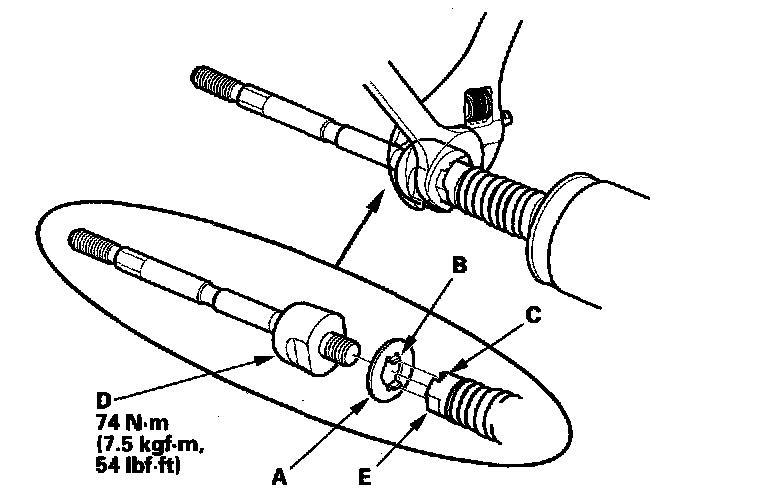 2. Hold the flat surface sections (E) on the steering rack shaft with a wrench, and tighten both rack ends with another wrench. Be careful not to damage the shaft surface with the wrench.