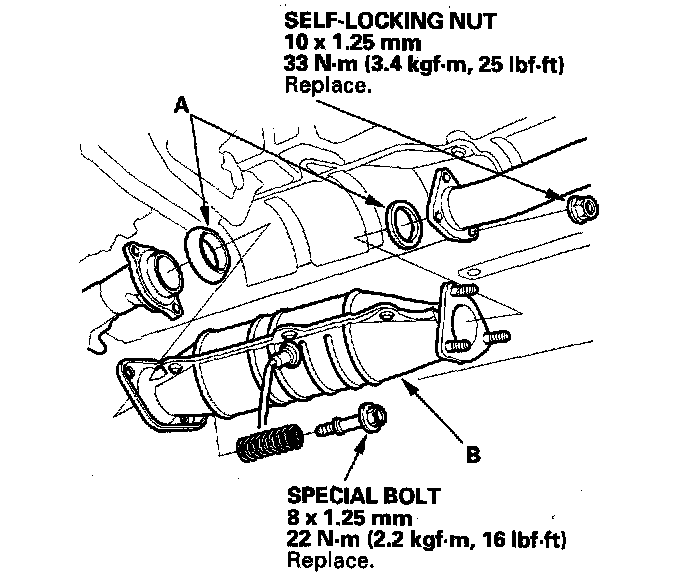 17. Install the new gaskets (A) and three way catalytic converter (TWC) (B).
