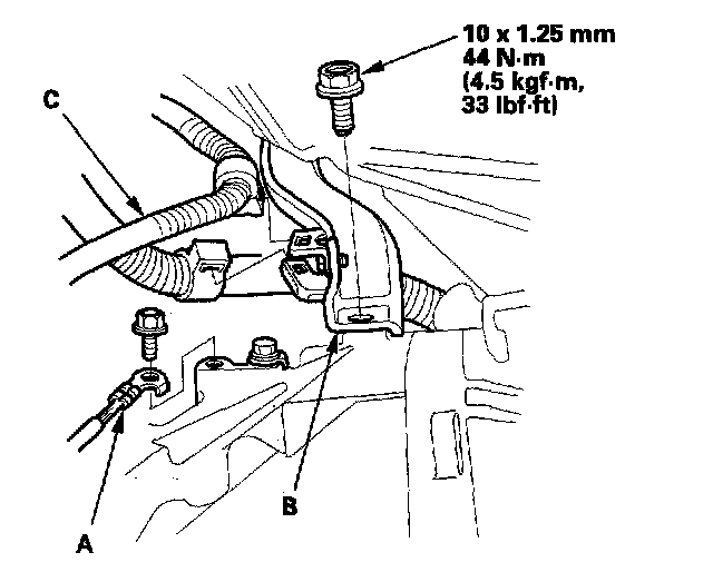 19. Install ground cable (A) the intake manifold bracket (B), and lower mounting bolt, then install the wire harness (C) on the intake manifold bracket.