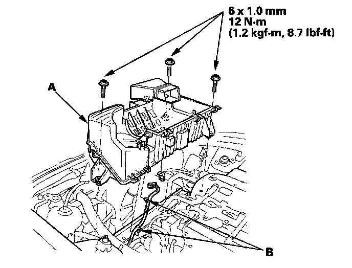 38. 2006 model: Install the air cleaner housing (A) then install the intake air temperature (IAT) sensor harness clamps (B).
