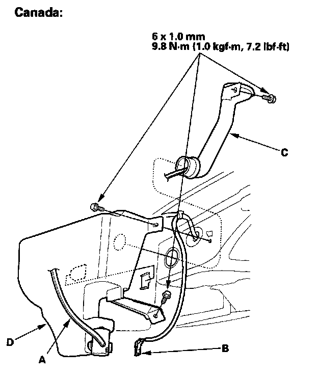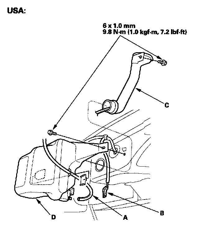 3. Remove the bolts, then separate and remove the filler neck (C) from the washer reservoir (D).