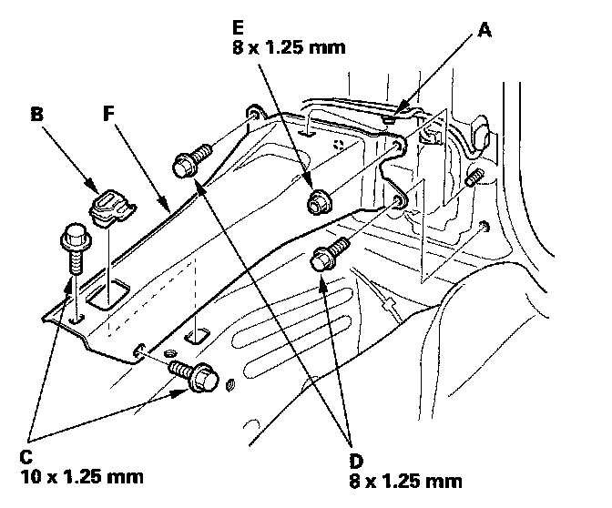 4. Remove the bolts (C, D) and nut (E), then remove the middle cross-member gusset (F).