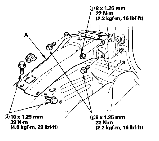 5. Install the gusset in the reverse order of removal. When installing the mounting bolts for the middle cross-member gusset (A), torque the mounting hardware in the sequence shown. If the mounting bolts are not toured in this sequence, damage to the quarter panel will occur.