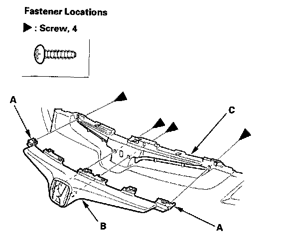 2. '03-05 models: Remove the screws and release the hooks (A), and remove the front grille (B) from the front bumper (C) by pulling it out. Take care not to scratch the front bumper.