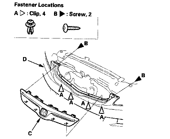 3. '06-07 models: Remove the clips (A) and screws (B), then remove the front grille (C). Take care not to drop the clips and screws inside the front bumper (D).