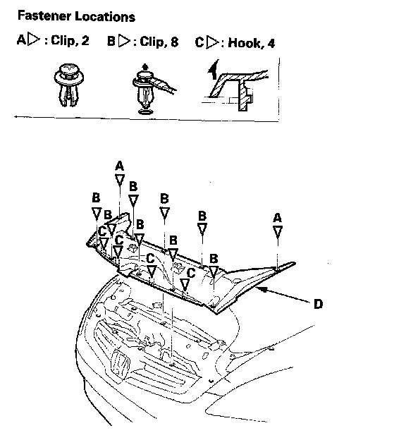 1. Remove the clips (A, B) and detach the hooks (C), then remove the front bulkhead cover (D).