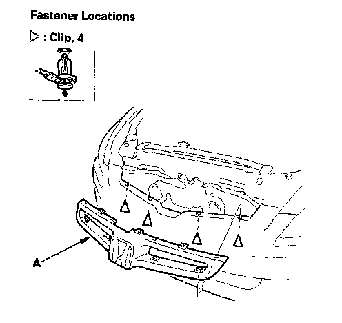 2. '03-05 models: Remove the clips, then remove the front grille (A). Take care not to drop the clips inside the front bumper.