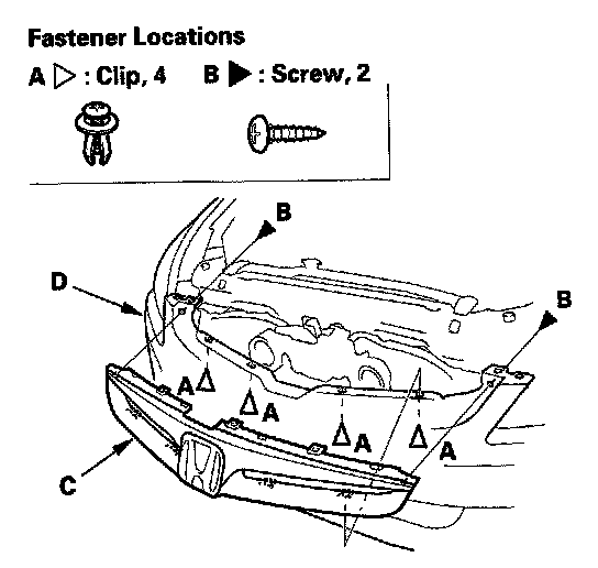 3. '06-07 models: Remove the clips (A) and screws (B), and remove the front grille (C) from the front bumper (D) by pulling it out. Take care not to scratch the front bumper.