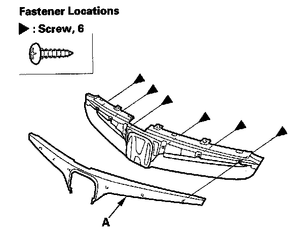 4. '06-07 models: If necessary, remove the screws, then remove the upper grille molding (A) from the front grille.