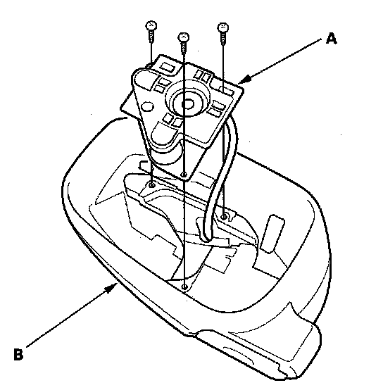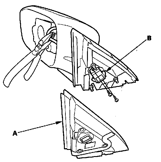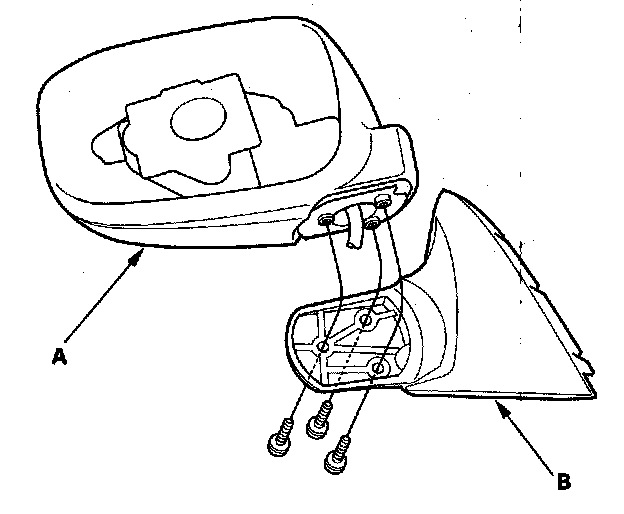 7. Remove the three screws, and separate the mirror housing (A) from the bracket (B).
