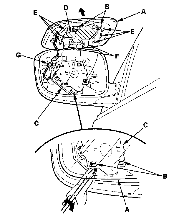 2. Separate the mirror holder from the actuator (C) by slowly pulling them apart while separating the adhesive portion (D) and releasing the hooks (E, F). If equipped, disconnect the mirror defogger connector (G).