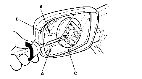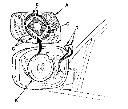 5. Separate the mirror holder (A) from the actuator (B) by slowly pulling them apart while separating the adhesive (C). If equipped, disconnect the mirror defogger connectors (D) from the heater pad terminals.