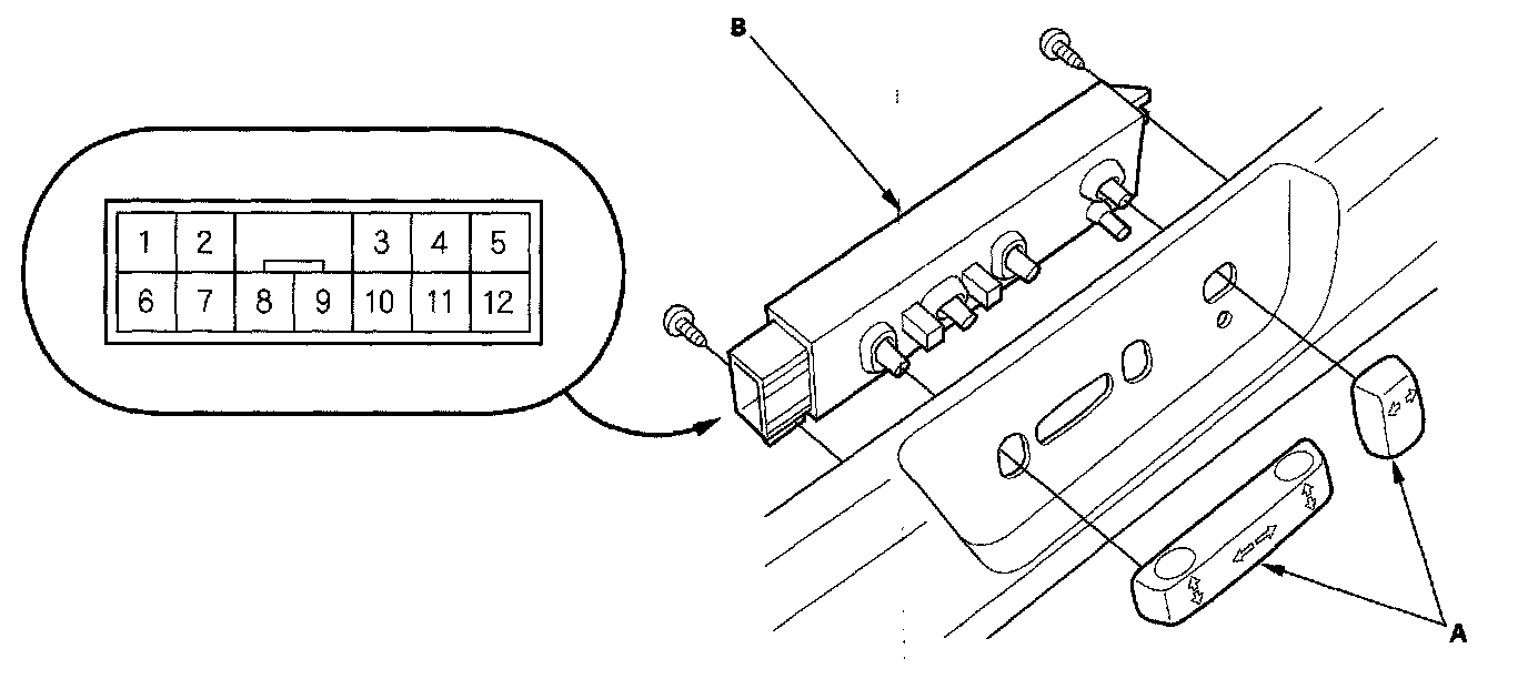 1. Remove the power seat adjustment switch knobs (A) and recline cover from the driver's power seat, then remove the two screws and the power seat switch.