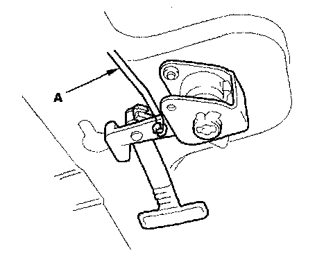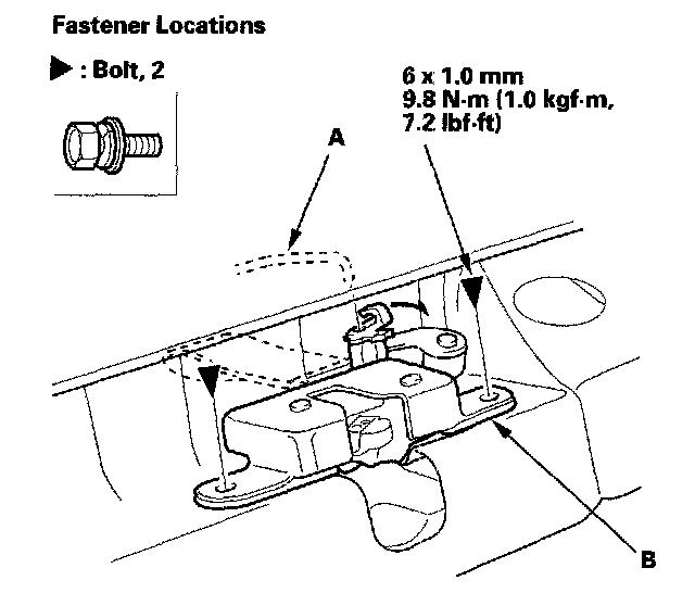 2. Disconnect the cylinder rod (A), remove the bolts, then remove the seat-back latch (B).