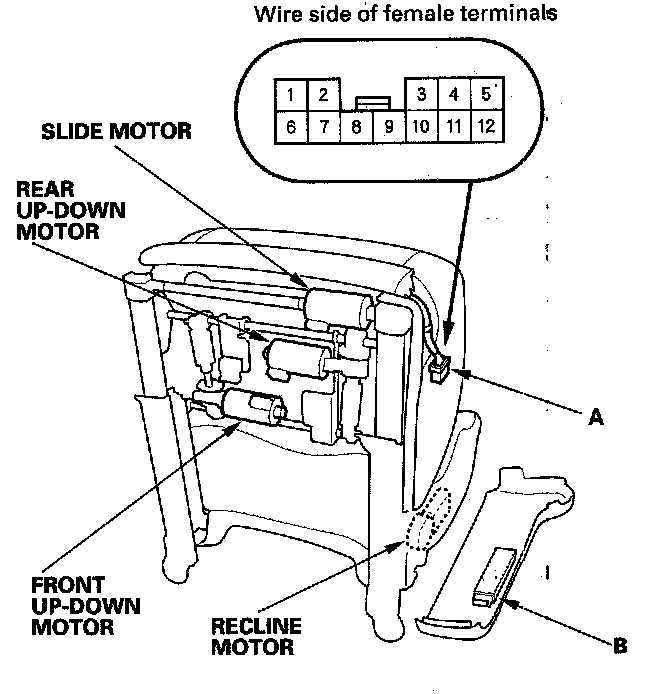 2. Disconnect the 12P connector (A) from the power seat adjustment switch (B).
