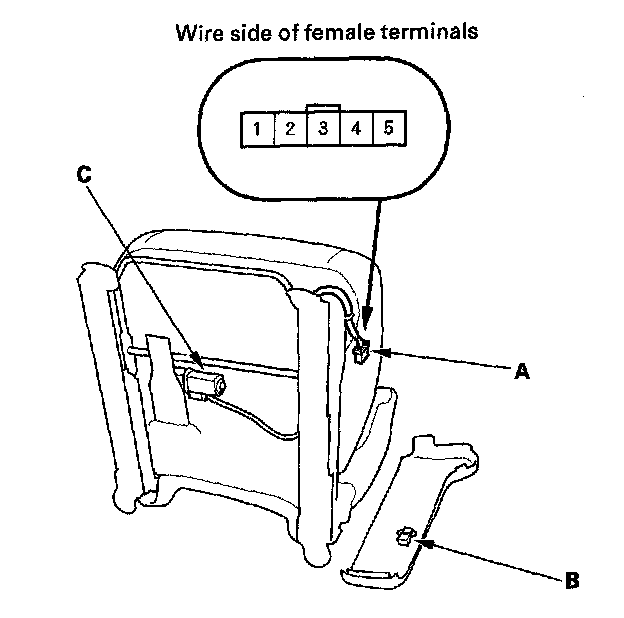 3. Test the motor (C) by applying battery voltage to the 5P connector No. 2 (or No. 4) and ground to the No. 4 (or No. 2) terminals. The motor should run.