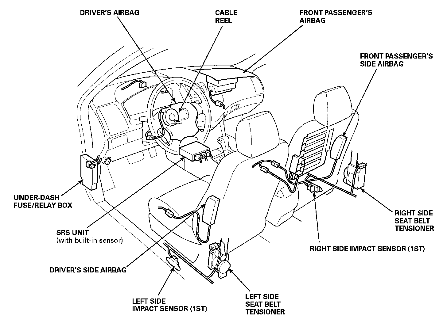 Supplemental Restraint System (SRS)This model has an SRS which includes a driver's airbag in the steering wheel hub, a passenger's airbag in the dashboard above the glove box, seat belt tensioners in the front seat belt retractors, side airbags in the front seat-backs, and side curtain airbags in the side of the roof side. The SRS unit is separate from the airbag assembly and has built-in sensors. The following precautions should be observed when performing sheet metal work, paint work, and repair work around the locations of the SRS components.