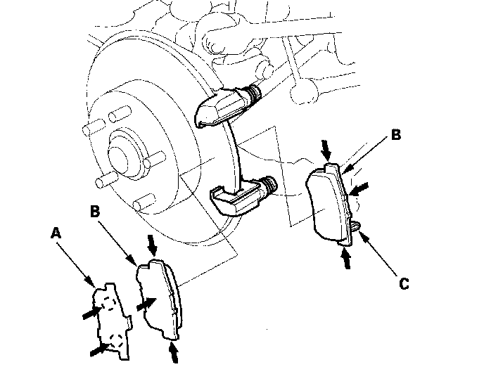 3. Check the thickness of the inner pad (A) and outer pad (B). Do not include the thickness of the backing plate.