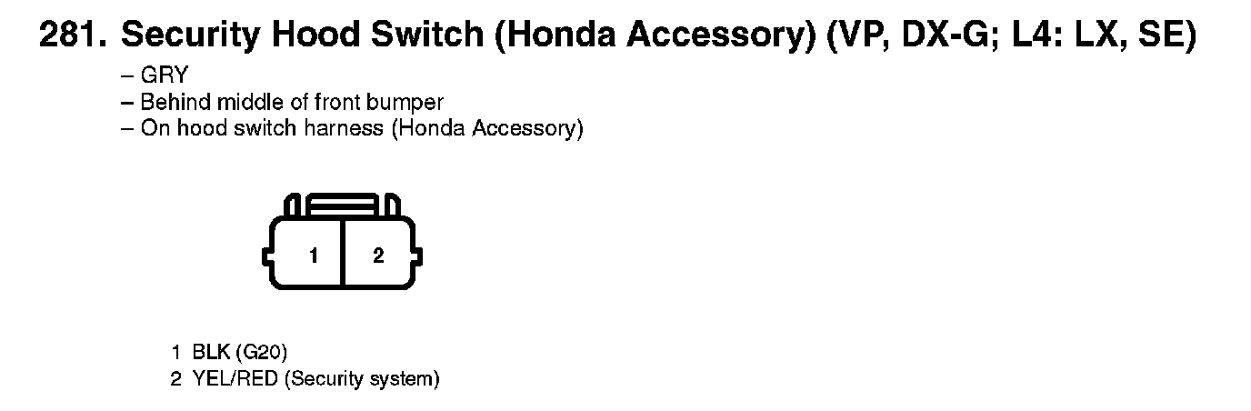 281. Security Hood Switch (Honda Accessory) (VP, DX-G; L4: LX, SE):