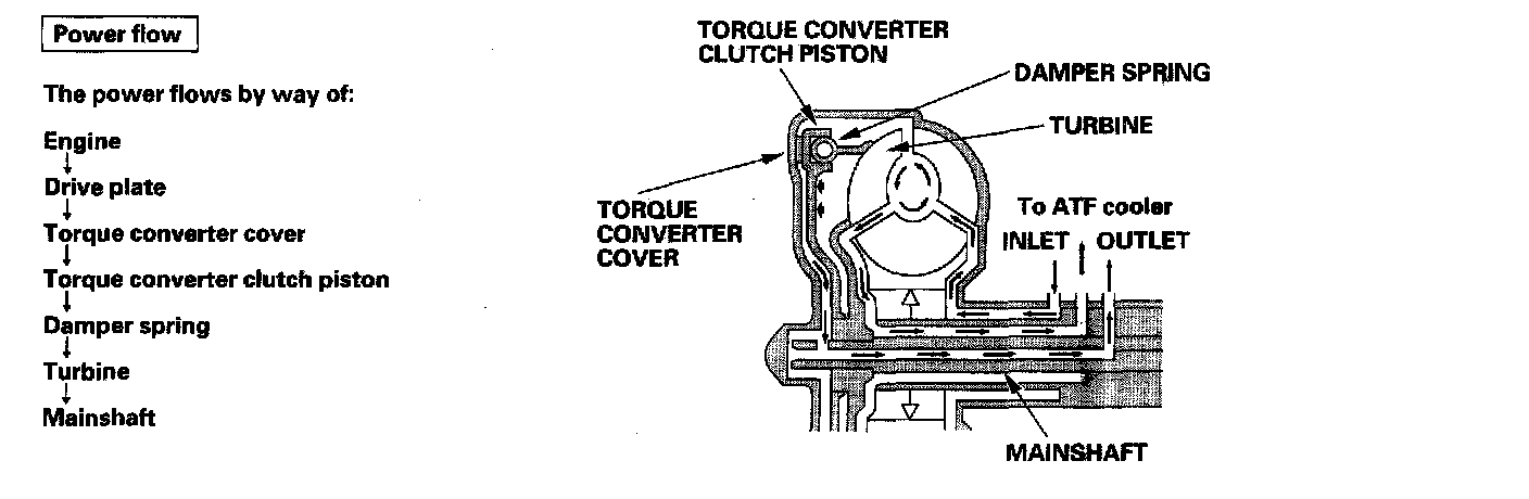Fluid entered from the chamber between the torque converter cover and the torque converter clutch piston passes through the torque converter and goes out through the chambers between the turbine and the stator, and between the pump and the stator. As a result, the torque converter clutch piston moves away from the torque converter, and the torque converter lock-up clutch is released; torque converter clutch lock-up is OFF.