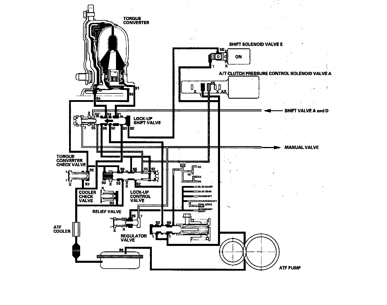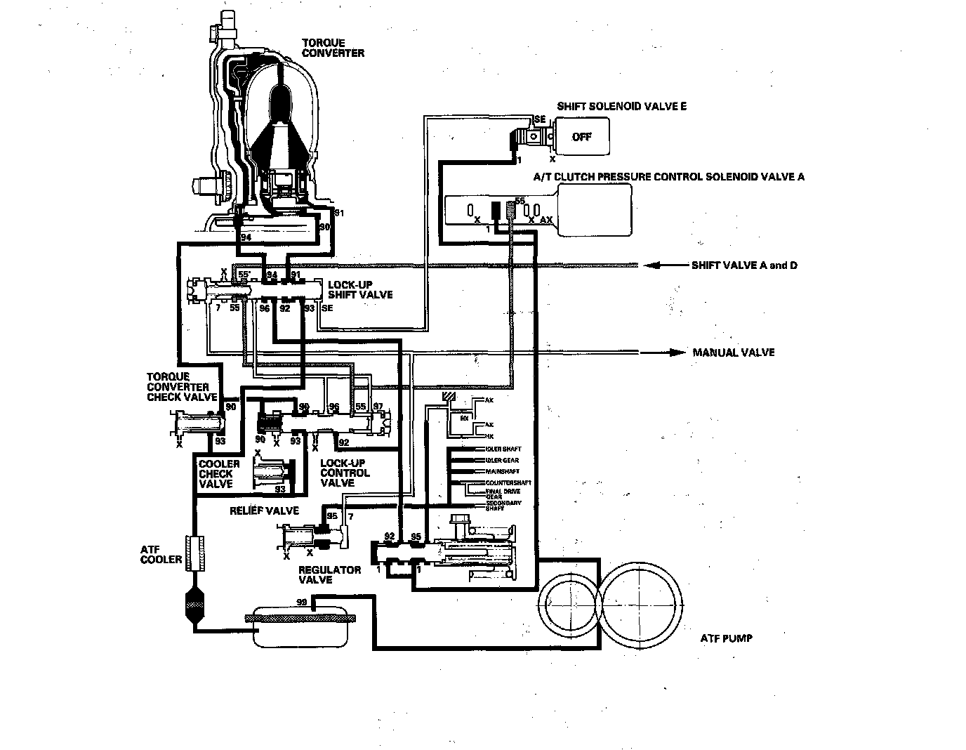 Shift solenoid valve E is turned OFF by the PCM, and shift solenoid valve E pressure (SE) is not applied to the lock-up shift valve. The lock-up shift valve stays to the right to uncover the torque converter pressure ports leading to the left side of the torque converter and releasing pressure from the right side of the torque converter. Torque converter pressure (92) changes to (94) at the lock-up shift valve, and enters into the left side of the torque converter to disengage the torque converter clutch. This keeps the torque converter clutch piston keeps away from the torque converter cover and the torque converter clutch lock-up is OFF.