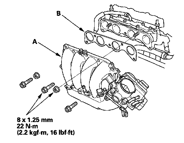 1. Install the intake manifold (A) with a new gasket (B), and tighten the bolts/nuts in a crisscross pattern in two or three steps, beginning with the inner bolt.