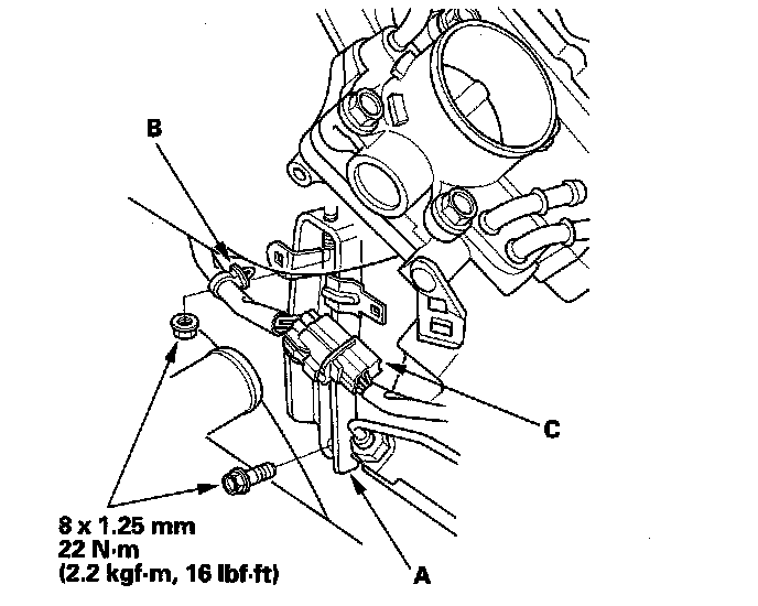 8. Remove the harness clamp (A) and the harness connector (B) from the intake manifold bracket, then remove the intake manifold bracket (C).