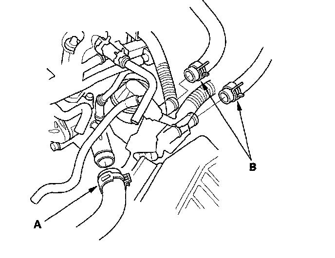 43. Remove the upper radiator hose (A) and heater hoses (B).