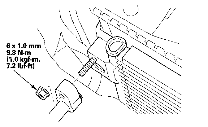 7. Remove the nut, then disconnect the discharge line from the A/C condenser.