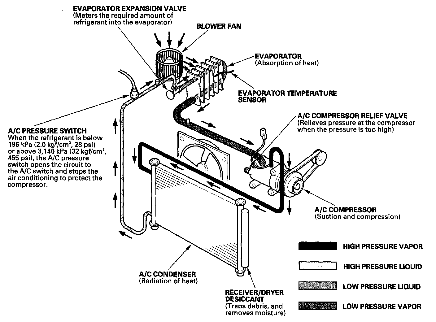 - All A/C system parts (compressor, discharge line, suction line, evaporator, condenser, receiver/dryer, expansion valve, O-rings for joints) are designed for refrigerant R-134a. Do not exchange with R-12 parts.