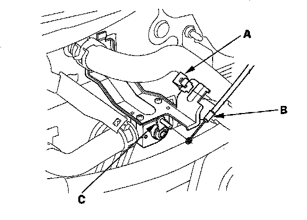 2. From under the dash, disconnect the heated valve cable housing from the cable clamp (A), and disconnect the heater valve cable (B) from the air mix control linkage (C).