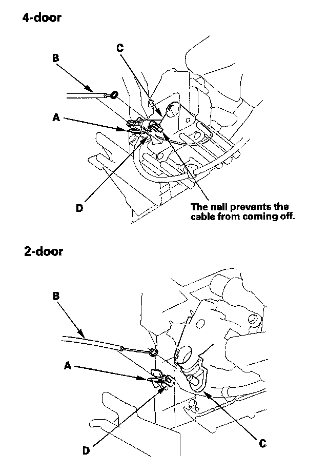4. Attach the heater valve cable (B) to the air mix control linkage (C) as shown step 2. Hold the end of the heater valve cable housing against the stop (D), then snap the heater valve cable housing into the cable clamp (A).