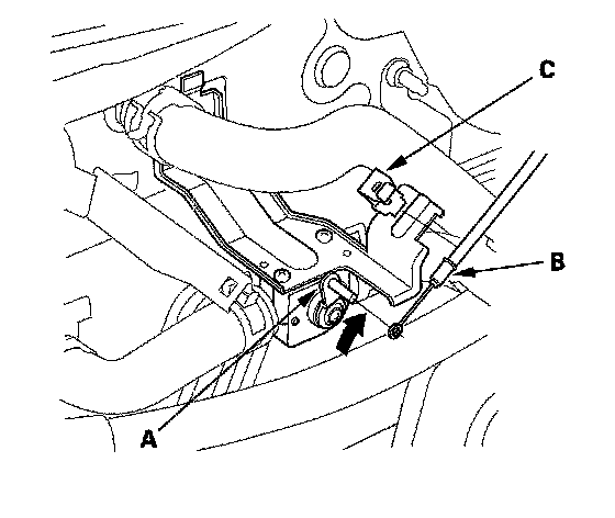 5. From under the hood, turn the heater valve arm (A) to the fully closed position as shown, and hold it. Attach the heater valve cable (B) to the heater valve arm, and gently pull on the heater valve cable housing to take up any slack, then install the heater valve cable housing into the cable clamp (C).