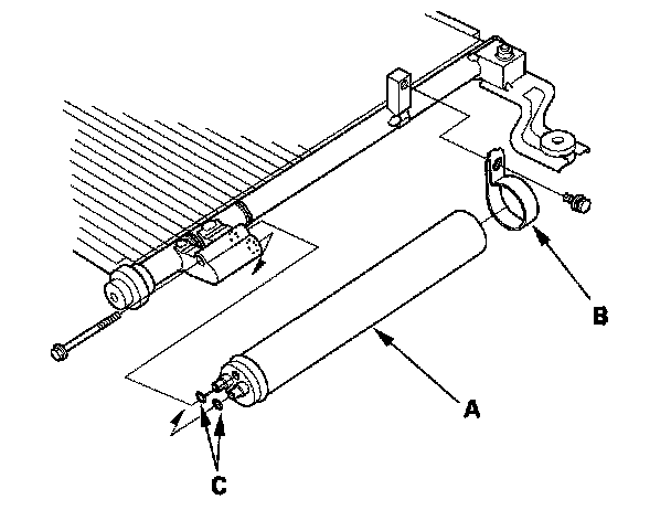 2. Remove the bolts from the A/C condenser, then remove the receiver/dryer (A), the bracket (B) and the O-rings (C).