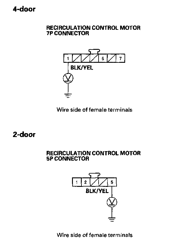 4. Measure the voltage between the No. 1 terminal of the recirculation control motor 7P (4-door) or No. 5 terminal of the 5P (2-door) connector and body ground.