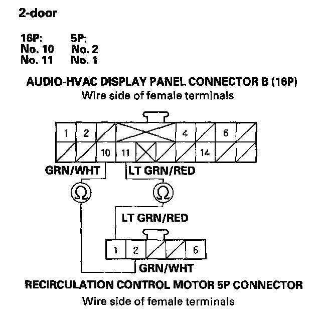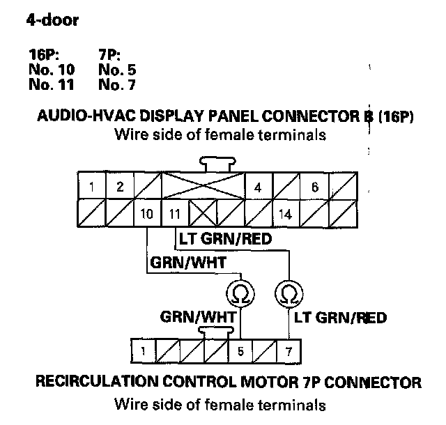 11. Check for continuity between the given terminals of audio-HVAC display panel connector B (16P) and the recirculation control motor 7P (4-door) or 5P (2-door) connector.