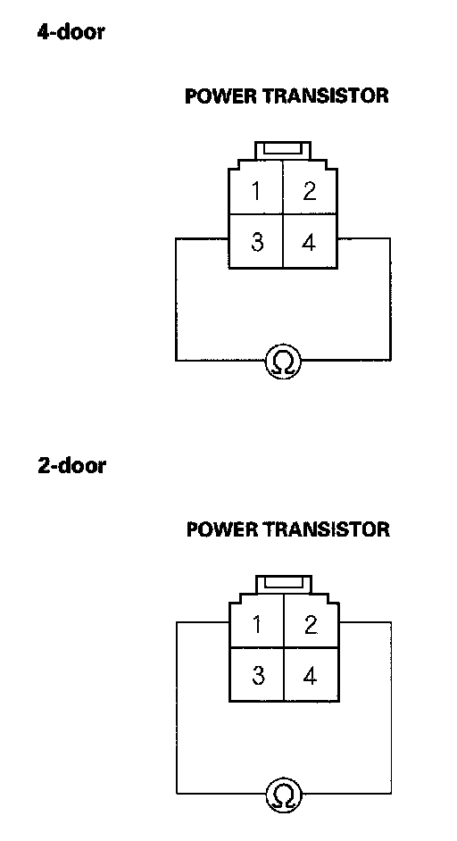 2. Measure the resistance between the No. 3 and No. 4 (4-door) or No. 1 and No. 2 (2-door) terminals of the power transistor. It should be about 1.4 - 1.5 kohms.