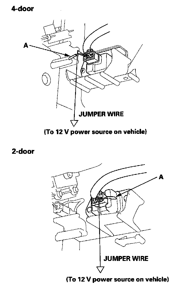 5. Supply 12 V to the No. 1 (4-door) or No. 4 (2-door) cavity of the power transistor connector with a jumper wire.