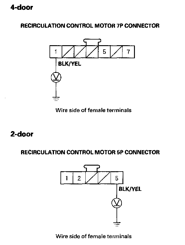 4. Measure the voltage between the No. 1 (4-door) or No. 5 (2-door) terminal of the recirculation control motor 7P (4-door) or 5P (2-door) connector and body ground.