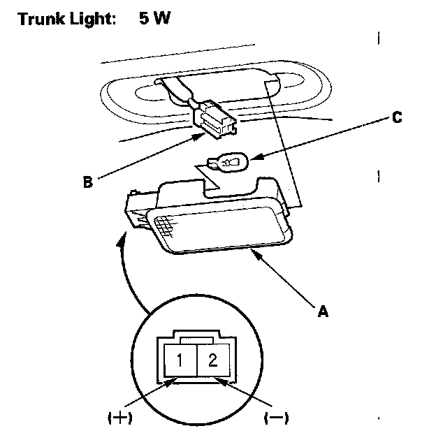 4. Check for continuity between the No. 1 (+) and No. 2 (-) terminals. There should be continuity. If there is no continuity, check the bulb (C). If the bulb(s) is OK, replace the trunk light.