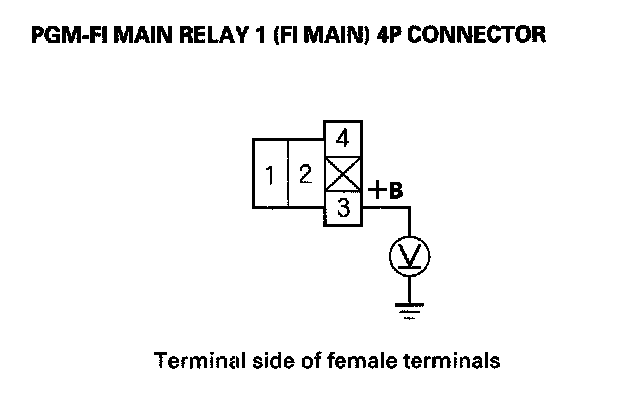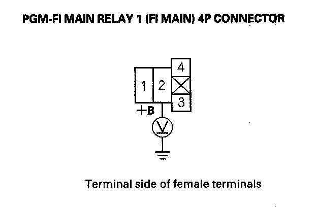 59. Measure voltage between PGM-FI main relay 1 (FI MAIN) 4P connector terminal No. 2 and body ground.