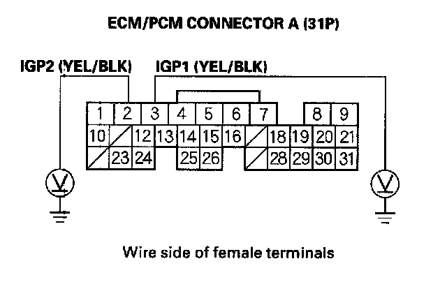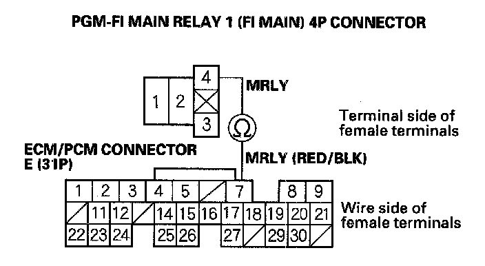 27. Check for continuity between body ground and PGM-FI main relay 1 (FI MAIN) 4P connector terminals No. 2 and No. 3 individually.
