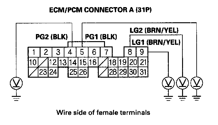 62. Measure voltage between body ground and ECM/PCM connector terminals A4, A5, A8, and A9 individually.