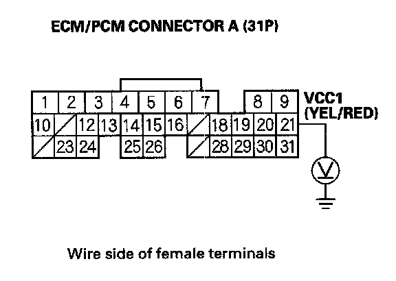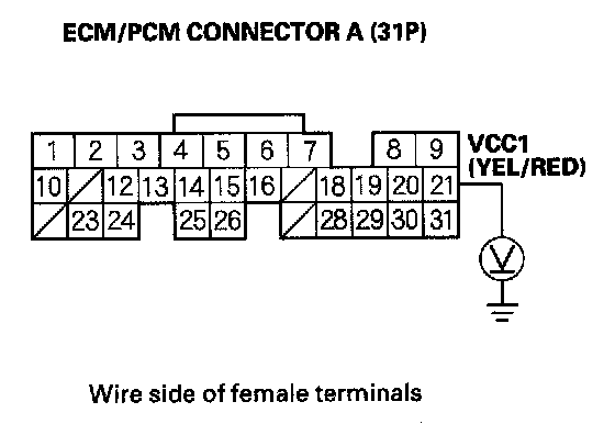 65. Disconnect the connector from each of these sensors, one at a time, and measure voltage between body ground and ECM/PCM connector terminal A21 with the ignition switch ON (II).