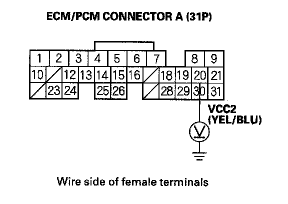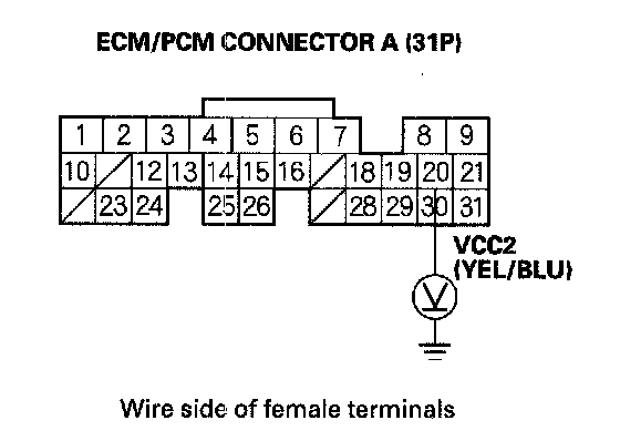73. Disconnect the connector from each of these sensors, one at a time, and measure voltage between body ground and ECM/PCM connector terminal A20 with the ignition switch ON (II).